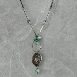 Oxidized sterling silver necklace with heart cut out and hammered links on chain with green chalcedony stones.