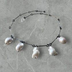 Hand made link necklace in oxidized sterling silver with beautiful white pearls by Dina.